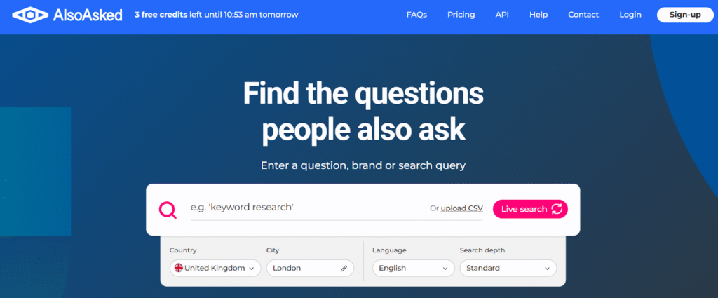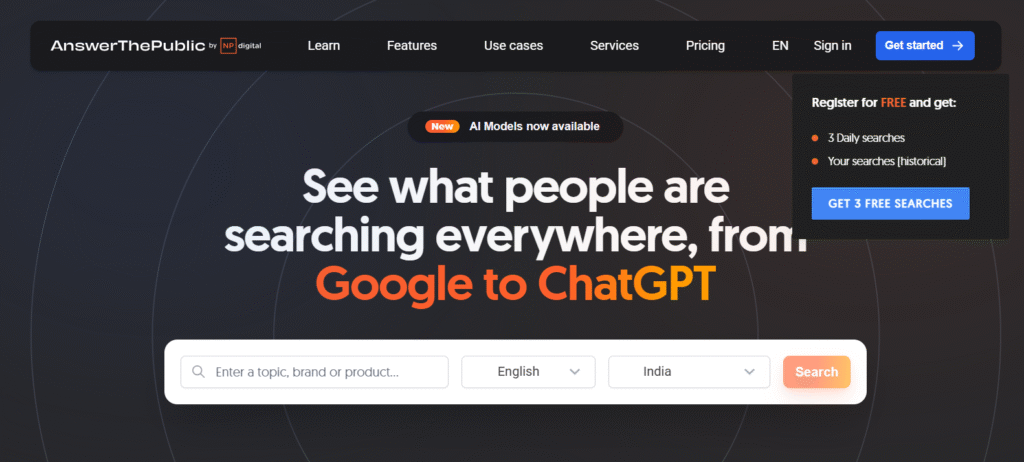 This tool is developed by Neil Patel, a prominent digital expert. It provides possible searches happening on Google /AEOs in question format.