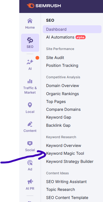 Step 2: Go to the Keyword Magic Tool option from the side panel.