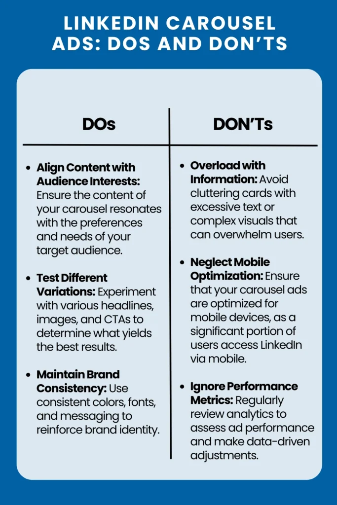 - Neglect Mobile Optimization: Ensure that your carousel ads are optimized for mobile devices, as a significant portion of users access LinkedIn via mobile.